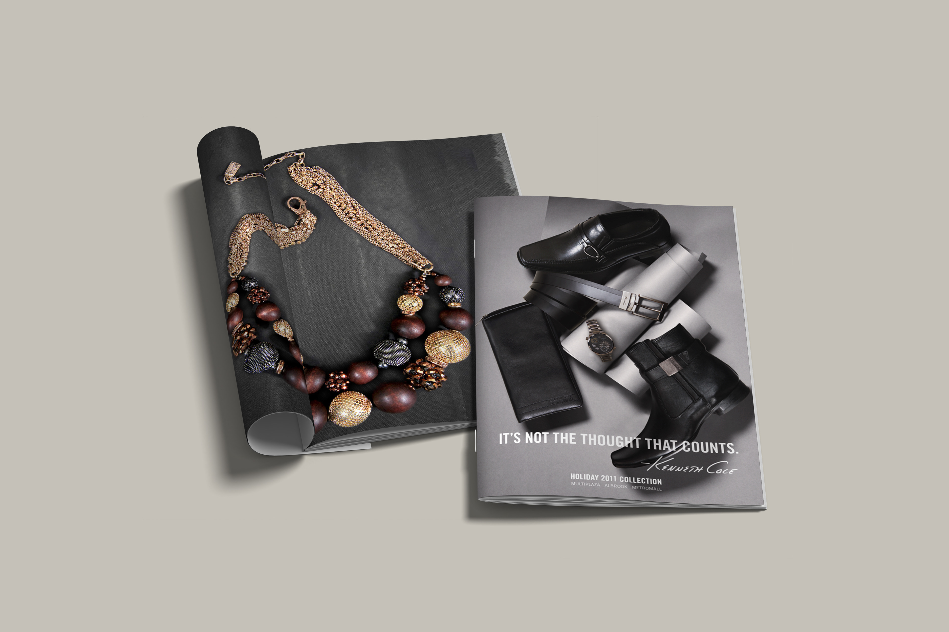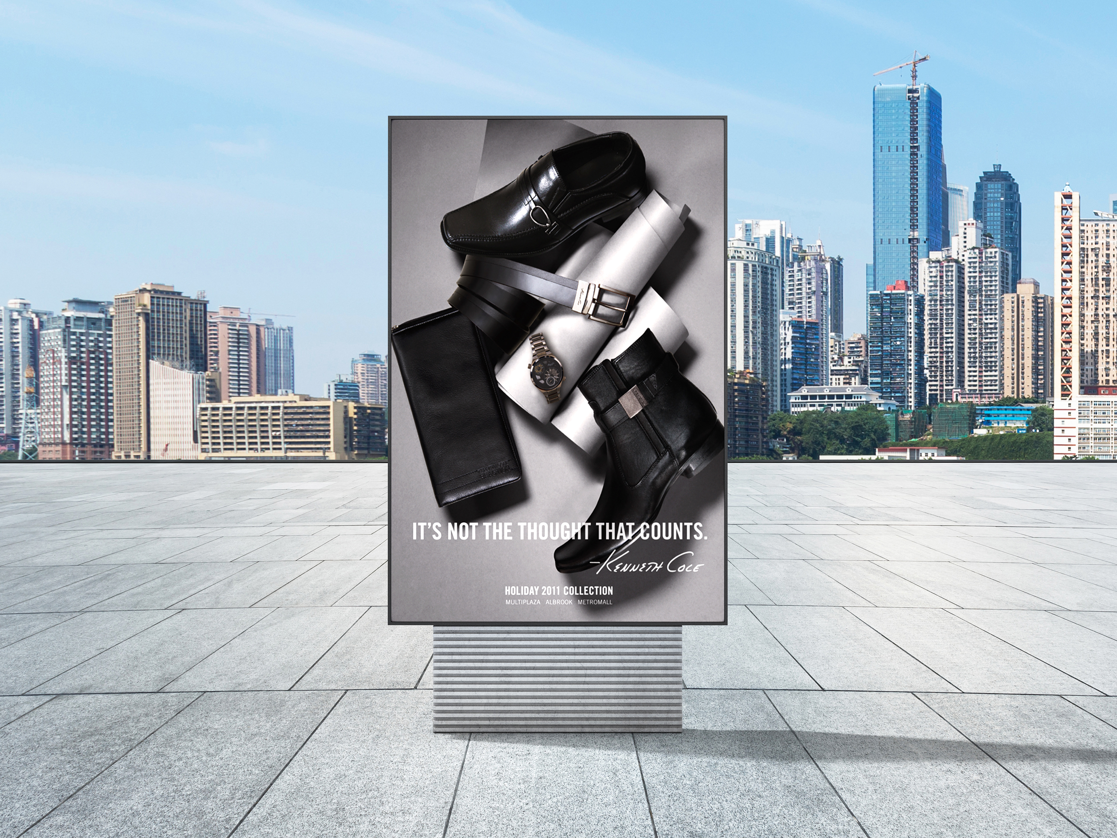 Para Kenneth Cole: La estrategia fue comunicar el dinamismo y la actitud de la marca. Se realizó un retoque fotográfico integral para crear una composición cohesiva y audaz que mostrara múltiples accesorios de forma unificada. El lema "IT'S NOT THE THOUGHT THAT COUNTS." se usó para conectar directamente con la audiencia, posicionando a la marca como impulsora de la acción.